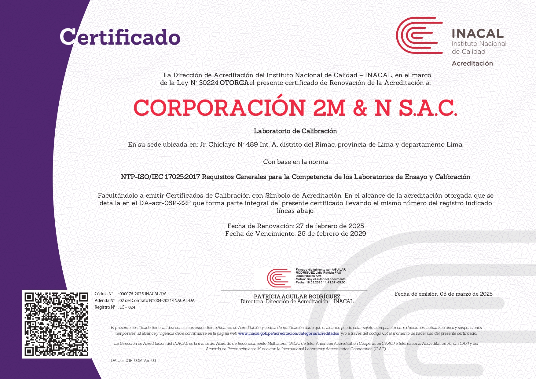 Somos un laboratorio de Calibración reconocido por INACAL-DA con registro LC-024, en cumplimiento de la NTP ISO/IEC 17025.